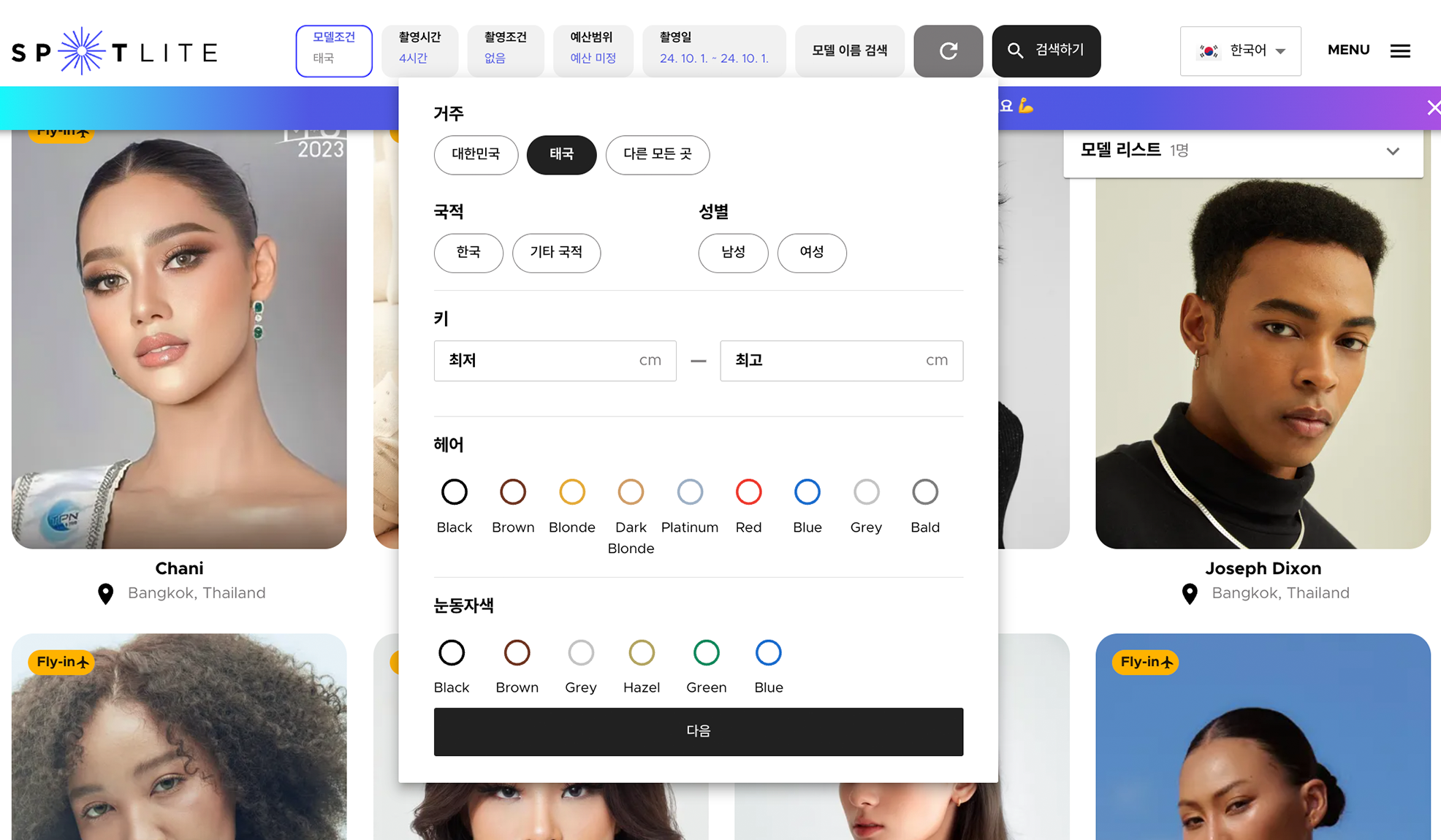 해외 로케이션 촬영을 준비 중인 관계자분들 주목해 주세요! 스포트라이트 웹사이트에서 거주지, 국적, 성별, 키, 헤어 스타일을 클릭하면 원하는 조건에 맞는 모델이 필터링됩니다. 이제는 거주지 항목에 '태국'이 추가되었어요. 태국 현지 모델을 더욱 쉽게 찾을 수 있습니다!