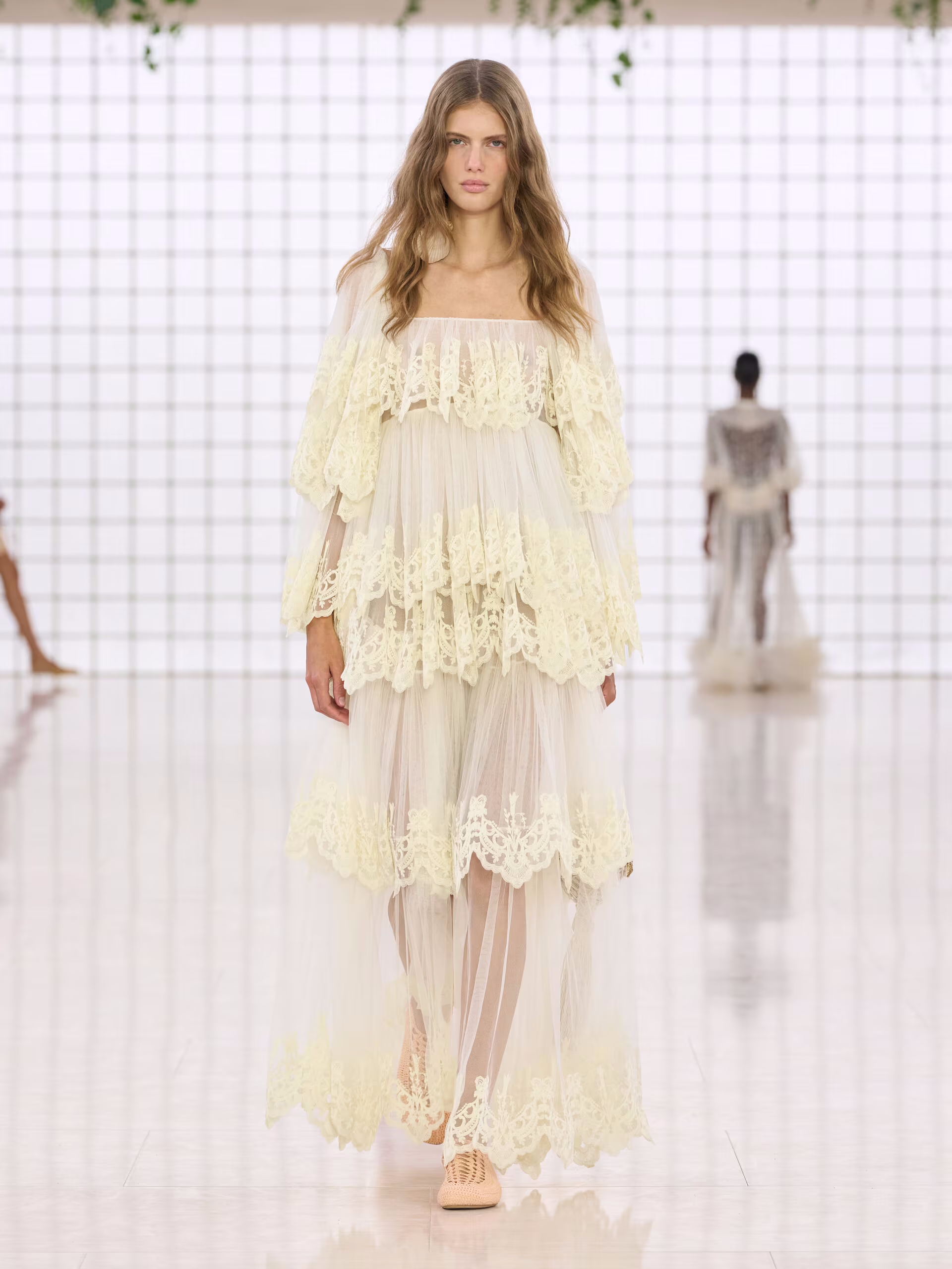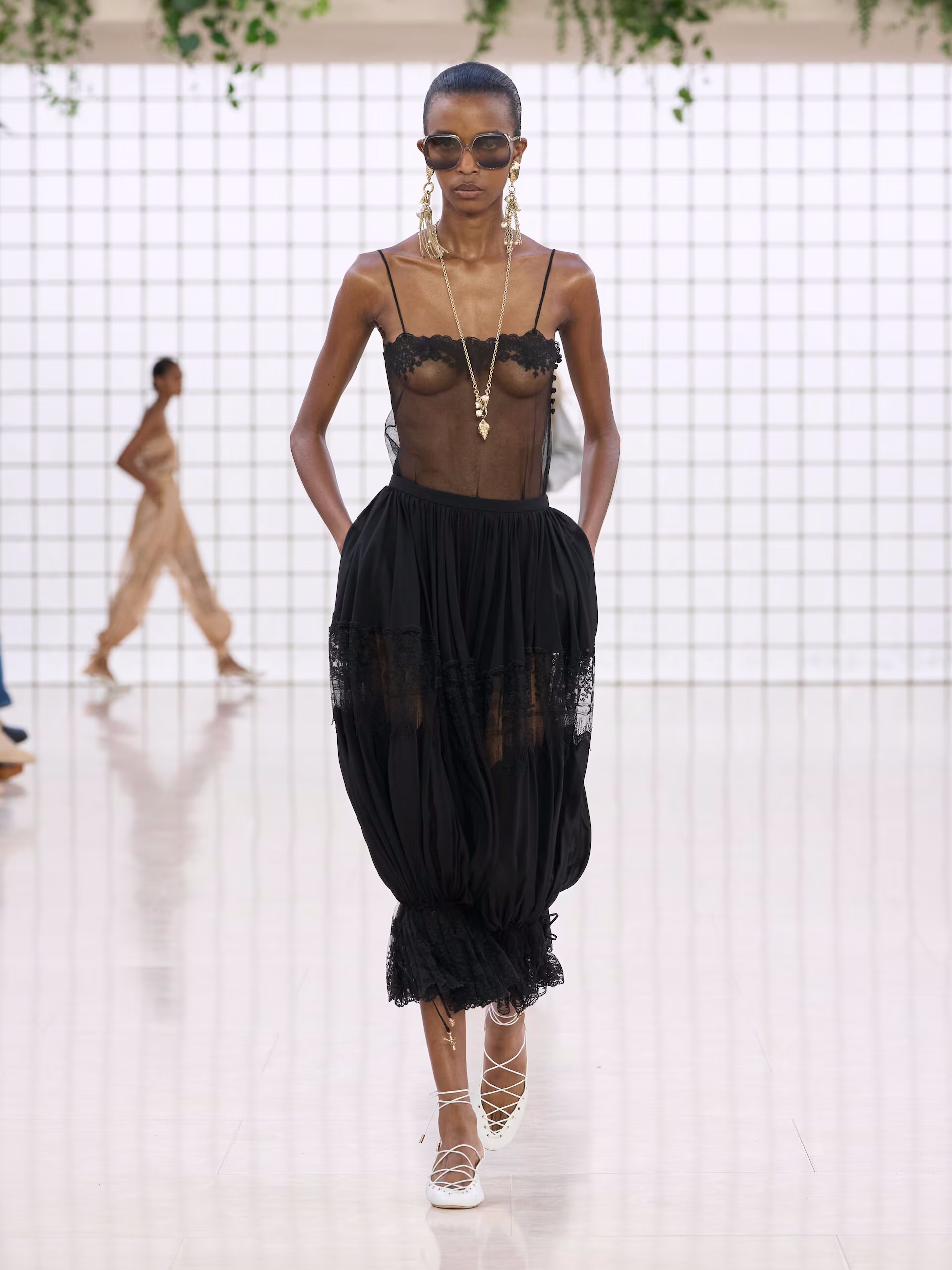 끌로에 2025 S/S 쇼는 몸이 드러난 시스루룩으로 막을 열었습니다. 크리에이티브 디렉터인 카말리가 말한 이번 시즌의 키워드인 '여성의 본능과 자유', '관능적인 에너지'가 쇼의 시작부터 물씬 느껴졌어요. (이미지=끌로에)