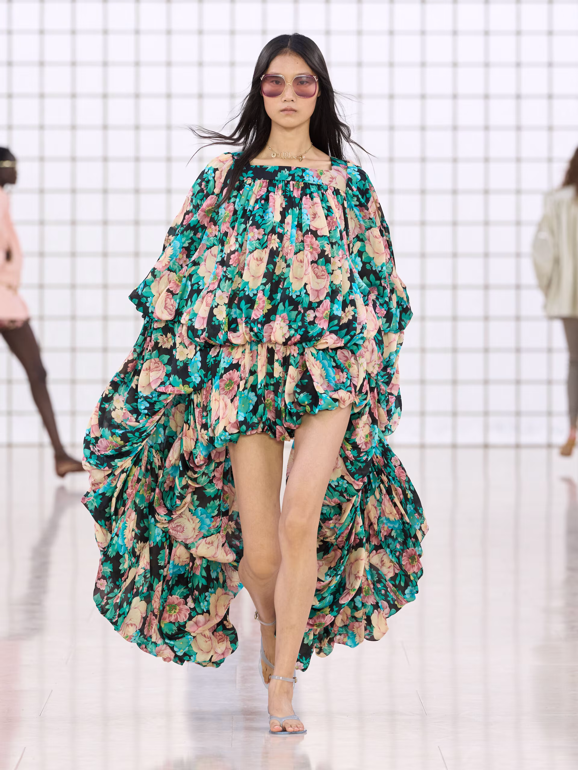 꽃무늬 패턴의 드레스가 시선을 사로잡았습니다. 2024년부터 풍선 모양 실루엣의 벌룬(버블) 스커트가 다시 유행했는데요. 이번 끌로에 쇼에서는 앞은 짧고 둥근 모양의 롱원피스로 변주를 줬어요. (이미지=끌로에)