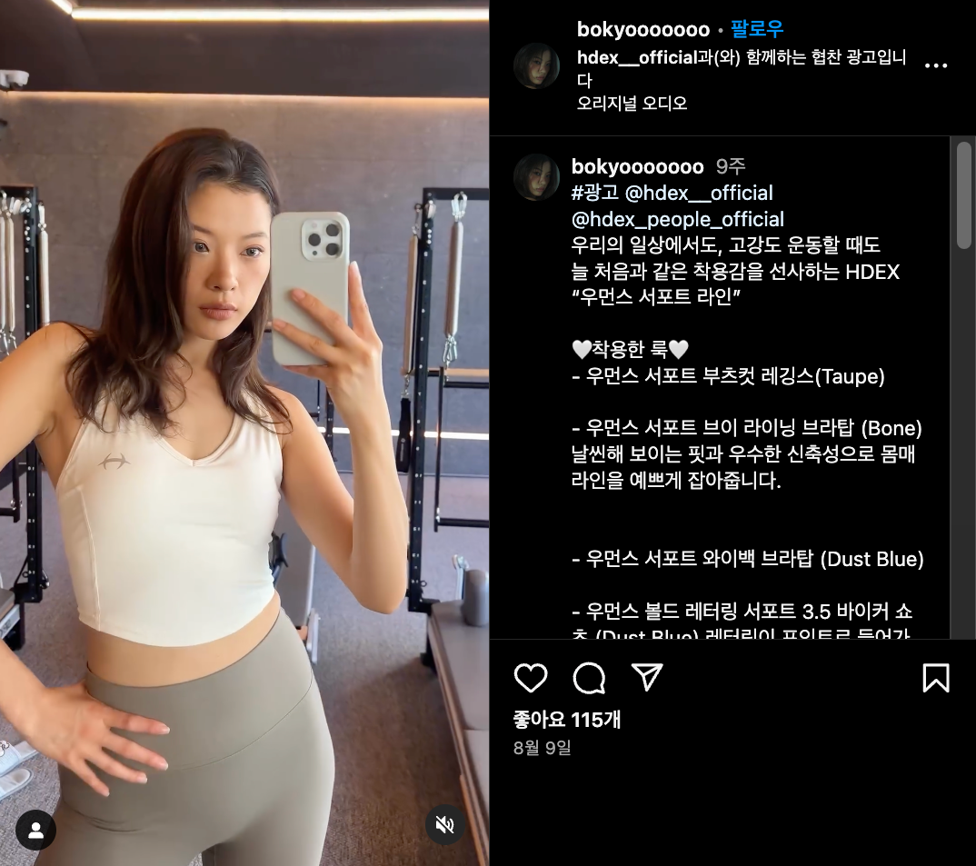 브랜드 이미지에 맞는 인플루언서를 섭외하는 것도 중요합니다. 인플루언서 마케팅은 TV 광고에 비해 상대적으로 저렴한 비용으로 높은 효과를 얻을 수 있는데요. 위 사진처럼 '일상과 고강도 운동할 때도 늘 처음과 같은 착용감을 선사하는 브랜드'라는 이미지를 소비자에게 심어주고 싶다면, 평소 고강도 운동을 하는 인플루언서인지 확인하는 디테일도 중요해요. (이미지 출처 : @bokyooooooo)