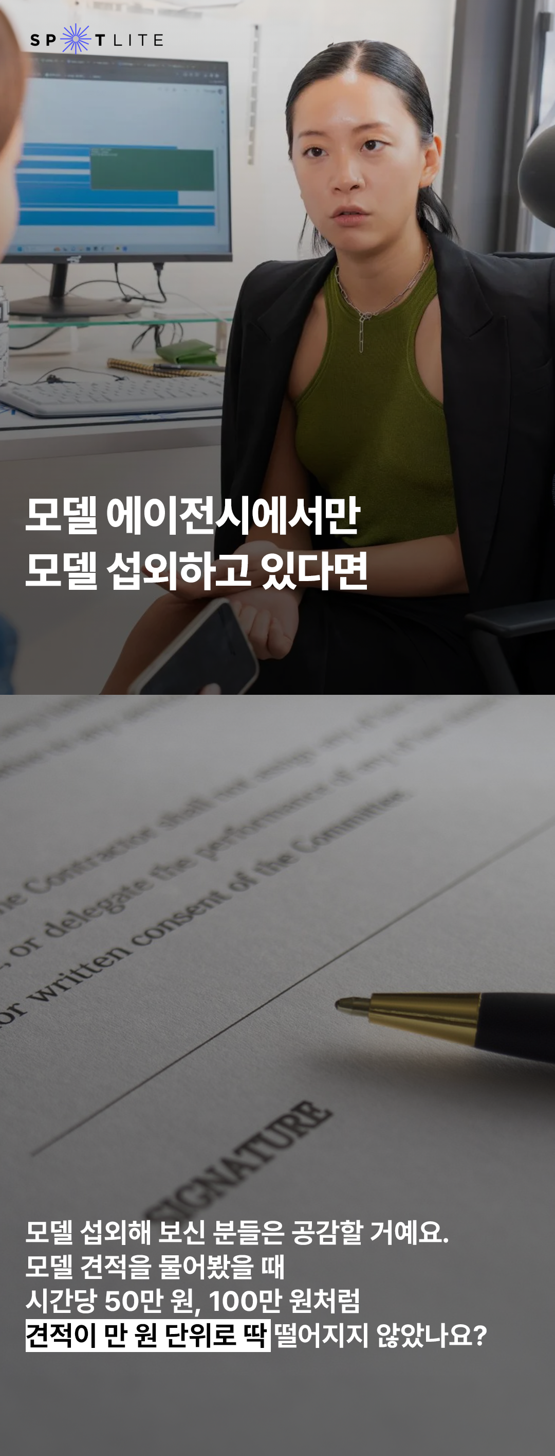 모델 에이전시와 무엇이 다른가요? 음식을 주문할 때 음식점에 전화하는 것보다 배달의민족, 쿠팡이츠와 같은 플랫폼을 통해 주문하는 게 편해졌잖아요. 그 차이랑 비슷해요. 스포트라이트는 모델과 브랜드를 이어주는 플랫폼입니다.