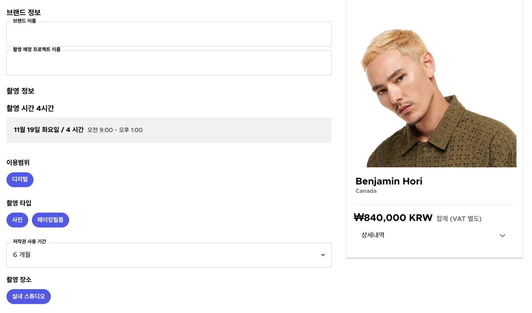 촬영 콘셉트나 브랜드에 어울리는 모델을 찾았다면 견적을 확인해 보세요. 촬영 시간, 이용 범위, 촬영 타입 등에 따라 정확한 모델 견적이 측정됩니다. 여러 명의 모델의 견적을 한 번에 확인할 수도 있어요.