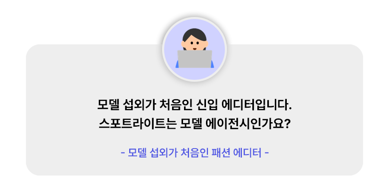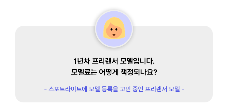 모델 본인이 자신의 견적을 책정하는 시스템입니다. '시간당 모델료'란 1시간 당 수령을 희망하는 최소 금액을 의미합니다. 스포트라이트에 등록된 모델은 언제든 모델료를 자유롭게 조정할 수 있습니다. 또한, 대금 지급은 평균적으로 촬영 직후 7일 내외에 정산이 이루어지고 있습니다.